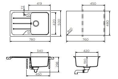 Комплектация: Отводная арматура с клапаном-автоматом 3 1/2" и переливом, сифон с возможностью подключения посудомоечной или стиральной машины.