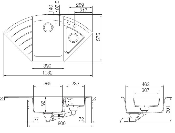 Отводная арматура с переливом и сифоном с возможностью подключения посудомоечной или стиральной машины.
