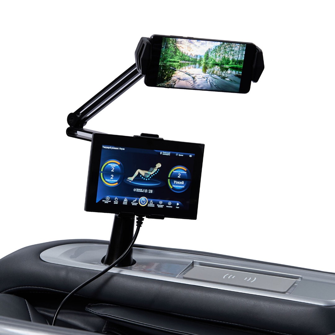 • В комплекте удобная подставка под телефон или планшет, которым можно управлять специальным джойстиком, встроенным в подлокотник, не отвлекаясь от массажа