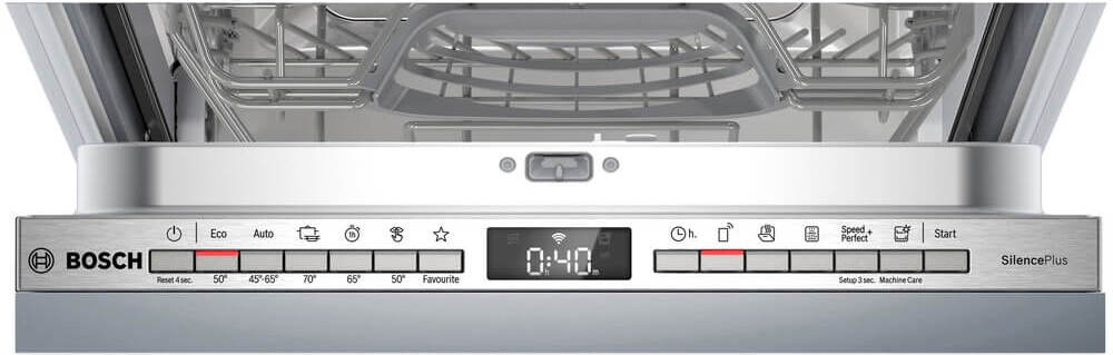 Прибор оборудован закрытой кнопочной панелью с дисплеем, на котором отображаются индикаторы наличия соли и ополаскивателя, а также время до окончания программы. Последнее дополнительно дублируется лучом на полу. При синхронизации со смартфоном старт машины можно активировать удаленно через приложение. Таймер отложенного старта устанавливается сроком до 24 часов.