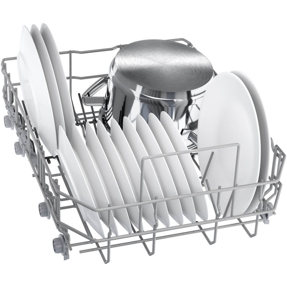 Посудомоечная машина Bosch SPV4EMX10E — узкая модель, которая рассчитана на единовременную обработку до десяти комплектов посуды. Прибор встраивается в нишу размером 81,5-87,5х45х55 см. Регулируемые задние ножки помогут нивелировать неровности пола.