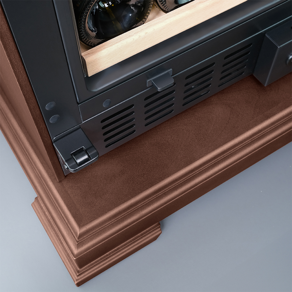 Винный холодильник оснащён надёжным и экономичным компрессором. Есть ручка, вентиляционная решётка и замок.